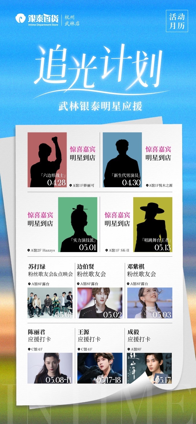 據(jù)悉,五一期間,馬龍、古子成、張晚意等明星將現(xiàn)身武林銀泰、與粉絲進(jìn)行互動;同時,蘇打綠、邊伯賢、鄧紫棋等明星的粉絲歌友也將在武林銀泰舉辦,預(yù)計將吸引一波又一波的年輕人前去“打卡”。有網(wǎng)友“爆料”,整個5月武林銀泰還會有多位明星到訪,杭州這家商場的“星味”確實讓人期待。
