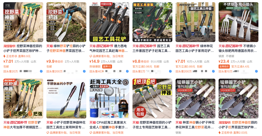 社交媒體討論的熱度以及網(wǎng)絡(luò)的搜索量,影響著眾多消費者的消費行為,與挖野菜相關(guān)的工具市場迎來了新的需求,小剪刀、菜筐子等原本小眾的商品,銷量開始顯著增長。天貓平臺的數(shù)據(jù)就給出了佐證,“挖野菜神器”關(guān)鍵詞的搜索量實現(xiàn)了58%的增長,便攜鏟、小型鏟類相關(guān)產(chǎn)品銷售量增長了80%,部分單品月流水近10萬。