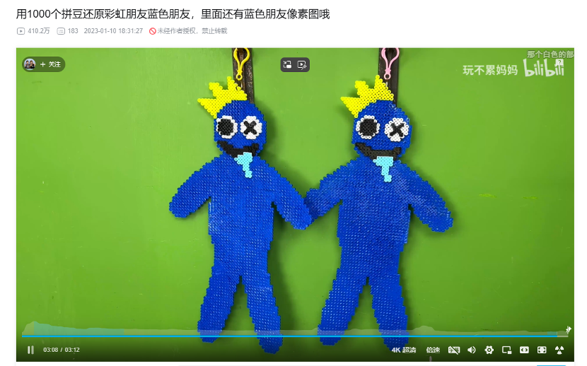 在各大社交平臺,#二次元手作#話題下聚集著驚人的創(chuàng)造力。B站UP主“玩不累媽媽”發(fā)布的《用1000個拼豆還原彩虹朋友藍色朋友》播放量突破400萬,評論區(qū)擠滿催更的粉絲;小紅書上的#流麻#話題瀏覽量已經(jīng)達到9.1億,一些自制流麻博主的教程視頻收藏量甚至過萬……