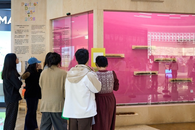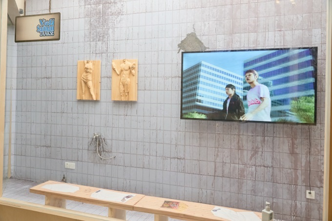 在《Pink Protocol粉色協(xié)議》之前,「國大在地藝術計劃」項目已經開展了三個展覽!断氩[一下嗎》將商場變?yōu)椤皠觥保蚱瞥R?guī)看展方式,進場的觀眾化身參與者,成為展的一部分;《帶到桑拿后面》里商場又成為“虛擬桑拿房”,藝術家利用3D打印貼圖將日本桑湯文化、古羅馬濕壁畫浮雕、現(xiàn)代公共洗浴空間私人物品與芬蘭傳統(tǒng)文化薈聚一堂,東西方文化實現(xiàn)交融碰撞,留下“人類在場證據(jù)”;《禮物(低至0元)》里,藝術家虛構了一個“0折”商場促銷事件,并提出“商品能否同時具有禮物的特征”疑問,嘗試回應“當商品的某些屬性無限接近于禮物,那商家到底想從購買者身上獲得什么”,以此思考、拉近商場與消費者的關系。