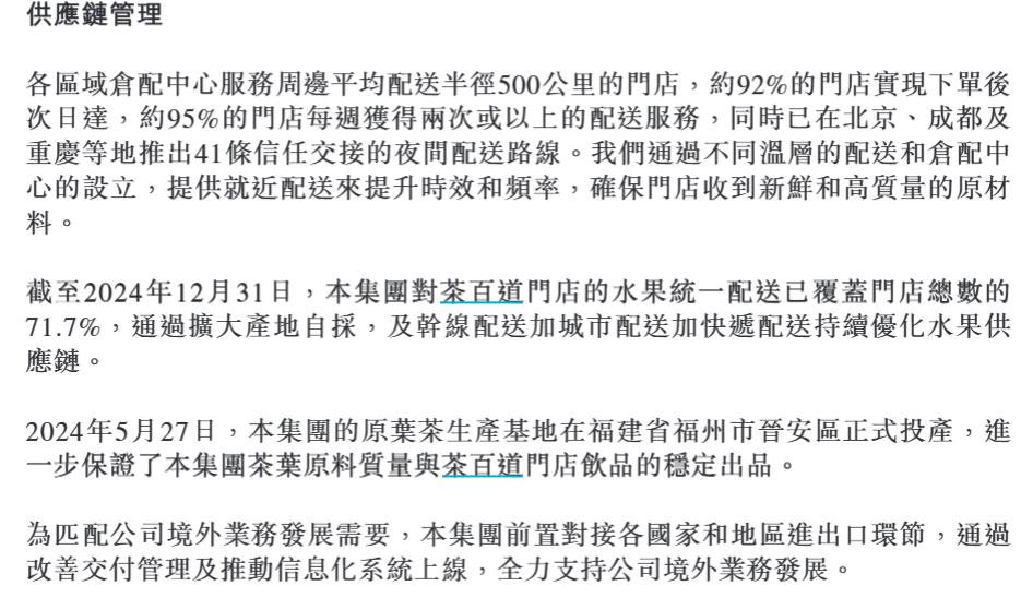 2024年5月,茶百道在福建投產(chǎn)了首個(gè)自有原葉茶生產(chǎn)基地,擁有了原葉茶全供應(yīng)鏈;在年報(bào)中,茶百道表示,目前門(mén)店水果統(tǒng)一配送已覆蓋總門(mén)店數(shù)的71.7%;相較此前,取得了一定的成效。然而,茶百道水果、牛奶等核心原料依然依靠采購(gòu),尚未實(shí)現(xiàn)自產(chǎn)。