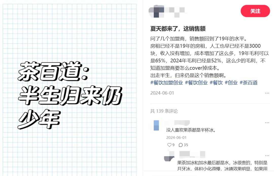 有茶百道加盟商直言,“淡季店里實(shí)收一天只有2000多”“銷(xiāo)售額回到了2019年的水平,但房租已經(jīng)不是19年的房租,人工也早已經(jīng)不是3000塊。”