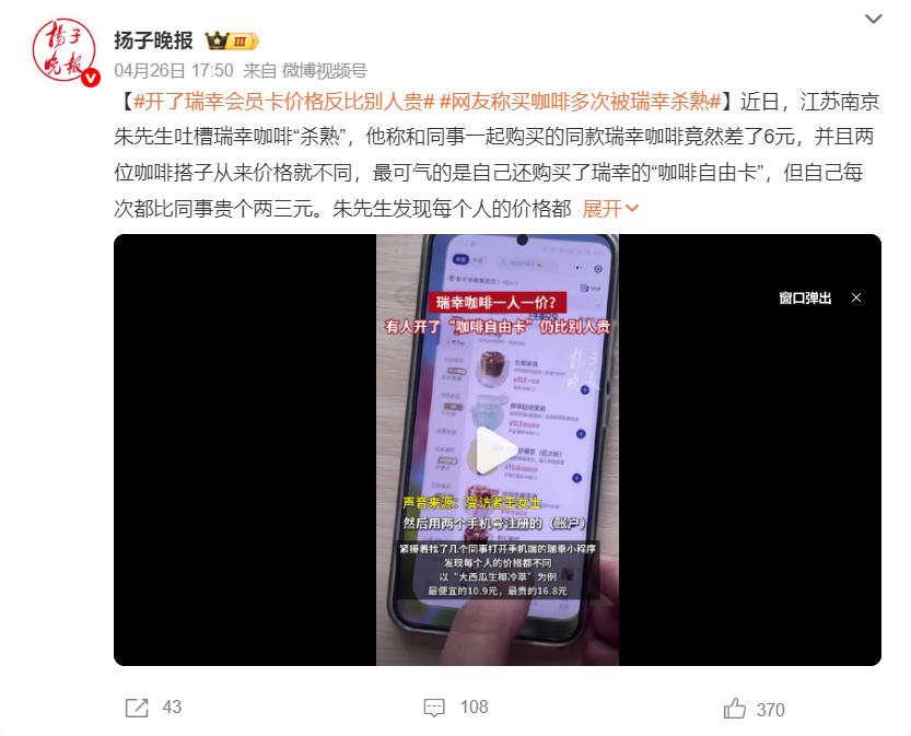 同款瑞幸咖啡價(jià)格差6元、開了瑞幸會(huì)員卡價(jià)格反倒比別人貴?近日,瑞幸咖啡被網(wǎng)友質(zhì)疑“殺熟”。