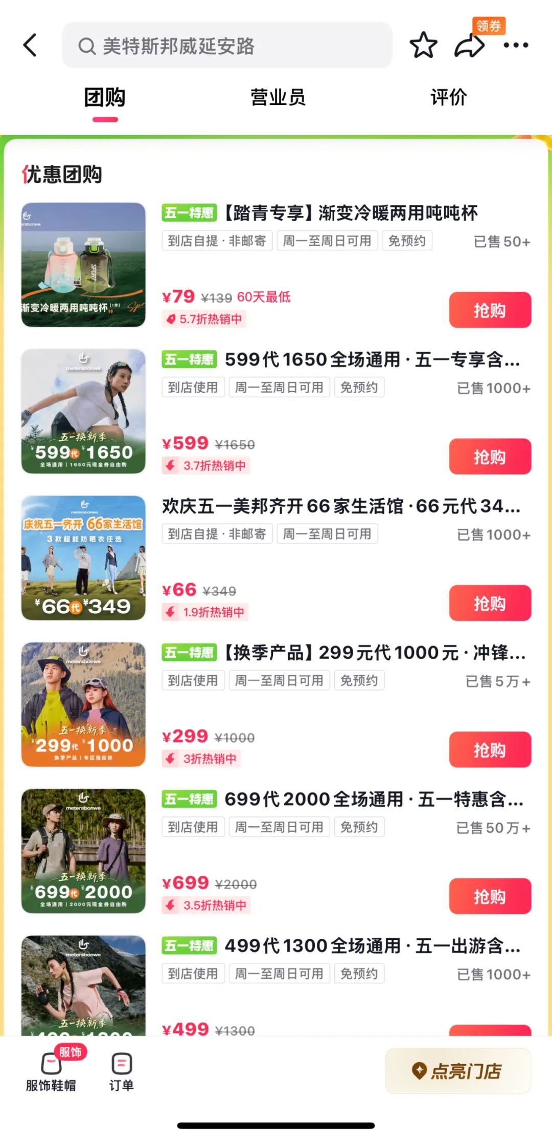 以抖音為例,《聯(lián)商網(wǎng)》查閱發(fā)現(xiàn),美邦抖音推出199元代500元、299元代1000元、499元代1300元、599元代1650元、699元代2000元等多項(xiàng)優(yōu)惠活動,針對五一開業(yè)的門店,還特別推出了66元代349元,算下來,服裝折扣區(qū)間在1.9折到4折。