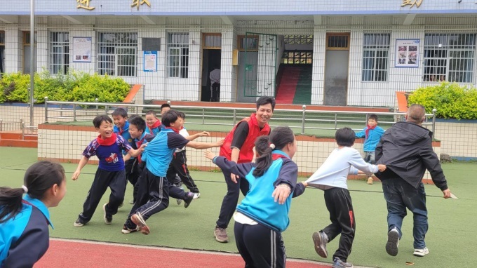 “叔叔,快跑!老鷹來(lái)啦!”同學(xué)們緊緊拽著志愿者的衣角,笑得眼睛瞇成一條縫。志愿者張開(kāi)雙臂,像母雞一樣護(hù)著身后的“小雞們”,操場(chǎng)上回蕩著歡快的尖叫聲。