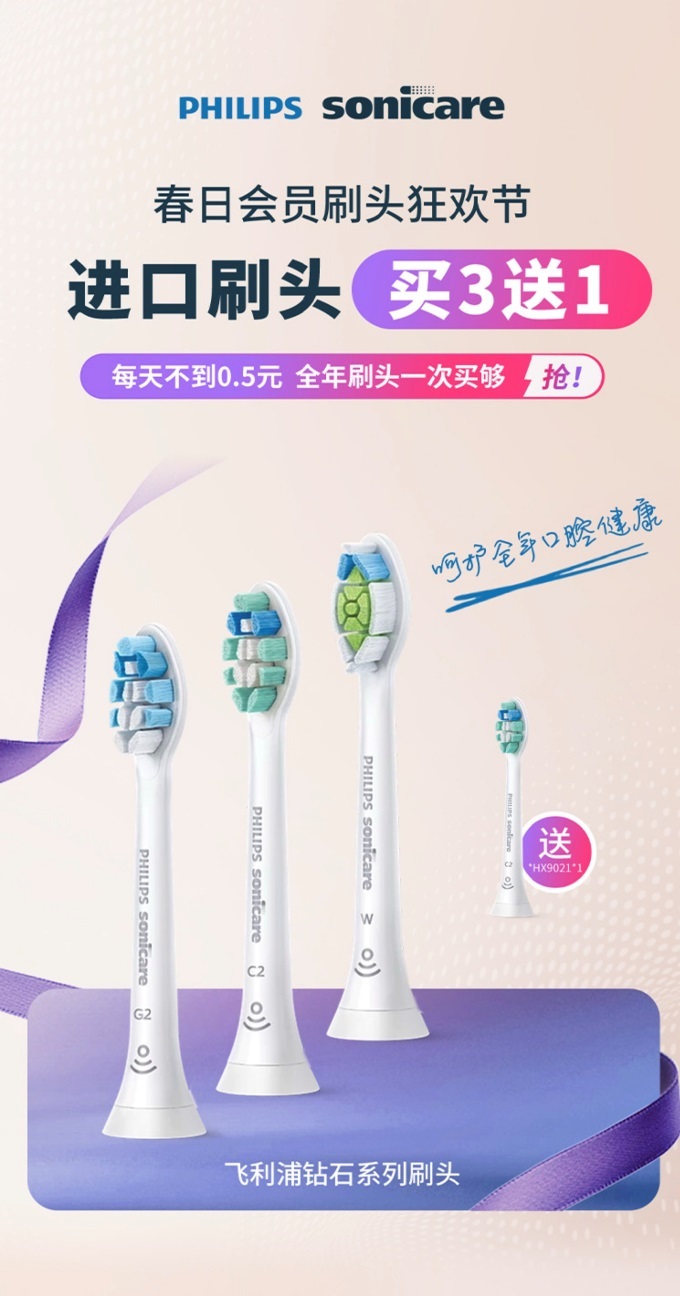 線上國補最高可享8.5折!更有「春日會員刷頭狂歡節(jié)」驚喜開啟,健康口腔一整年!品質(zhì)健康無需買貴,在京東官方旗艦店購買飛利浦健康好物,可享國補優(yōu)惠8.5折,最高立省千元。即日起至5月20日,登錄飛利浦健康生活Lab小程序或京東/天貓官方旗艦店,均可享受官方進口刷頭「買3送1」,輕松囤夠全年用量,超值福利助力日常護齒!