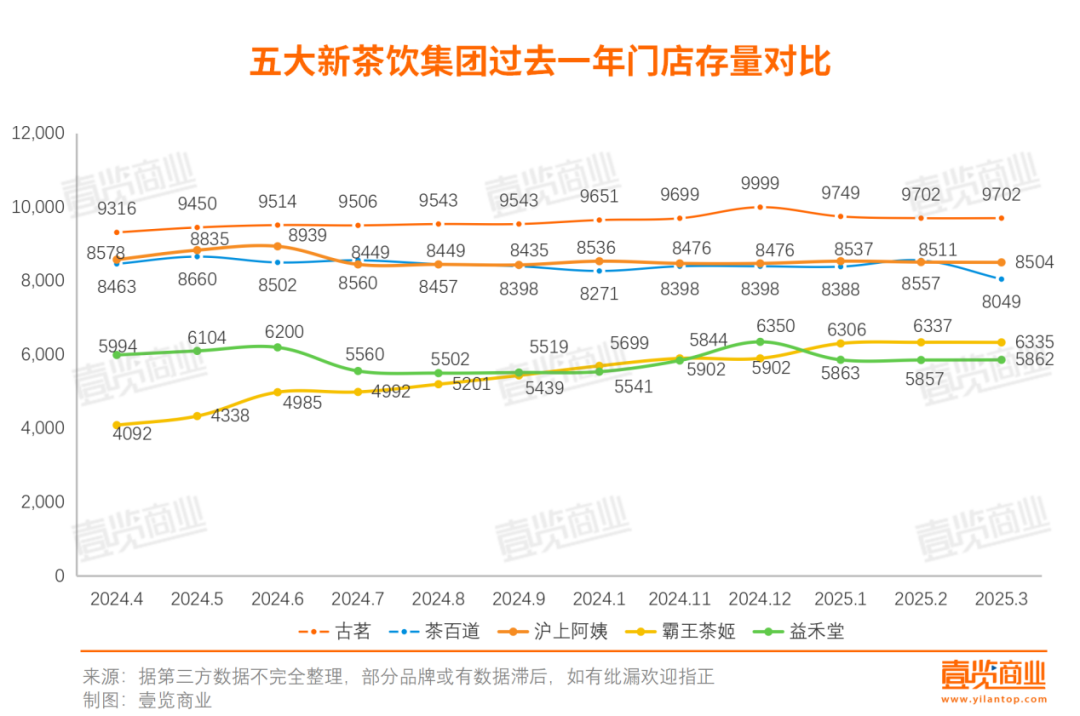 門店存量競爭態(tài)勢,也在五大新茶飲集團的年度變化中體現(xiàn)得淋漓盡致。過去一年,古茗、茶百道、滬上阿姨、霸王茶姬、益禾堂這五家品牌在門店規(guī)模上此消彼長,市場格局悄然生變。