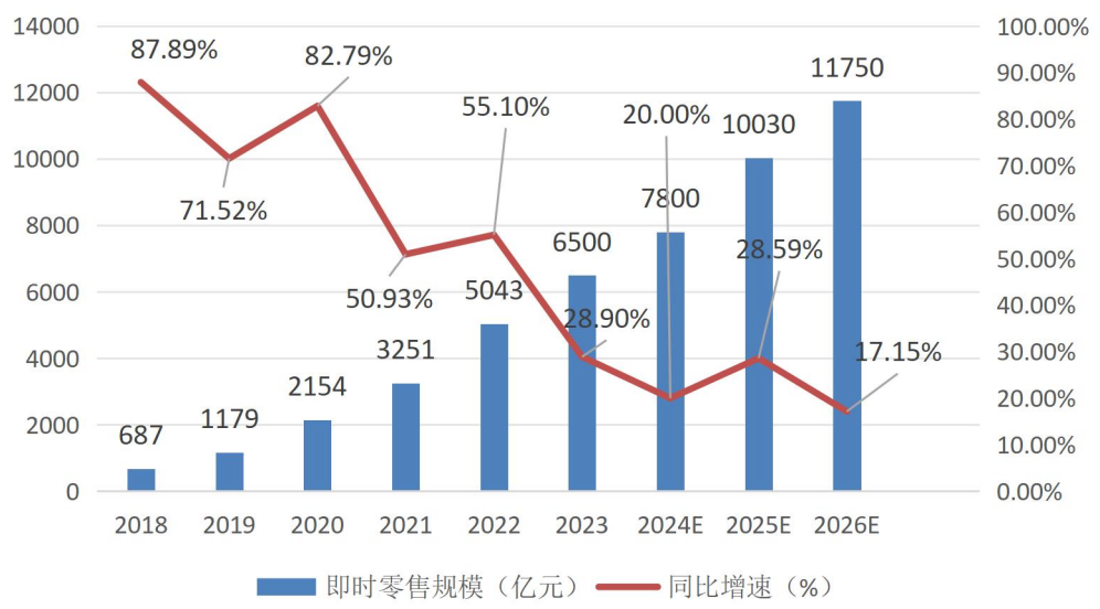 我國即時零售交易規(guī)模及增速,圖源:《即時零售行業(yè)發(fā)展報告》(2024)
