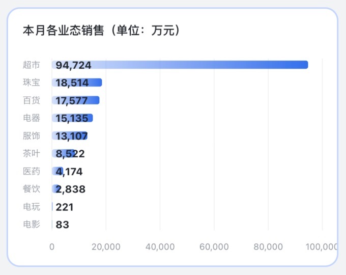 業(yè)務板塊中,超市、百貨、珠寶仍為核心支柱,累計銷售額分別為44.10億元、8.02億元和7.94億元,合計占比超集團總銷售額的74.83%;