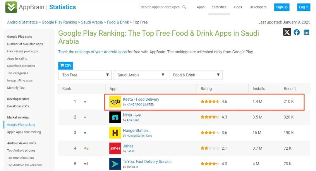 而據(jù)AppBrain統(tǒng)計數(shù)據(jù)顯示,截至1月8日,在沙特的谷歌商店里,Keeta的最新下載量高居餐飲類榜首,在谷歌和蘋果平臺上的評分等級均超過了當?shù)貎纱蟊就疗脚_HungerStation和Jahez。
