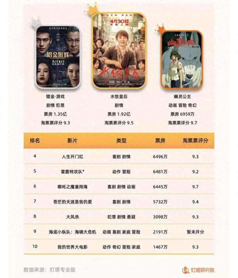 不僅如此,新片檔期內(nèi)最高票房未破2億元,較往年缺少頭部影片。2025年五一檔,《水餃皇后》《獵金·游戲》《幽靈公主》分別以1.92億元、1.35億元、6959萬元位列前三名。萬達電影旗下公司參與出品的《人生開門紅》排名第四,票房為6496萬元。