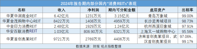 回顧2024年國內(nèi)“消費REITs”的成績單可以發(fā)現(xiàn),其底層資產(chǎn)的出租率及租金收入都能維持一定的穩(wěn)定水平,且年化現(xiàn)金分派率均在4%-6%之間。