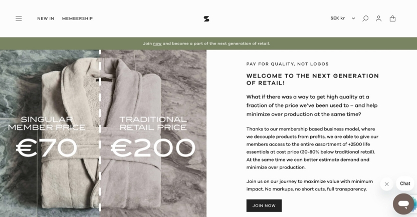 與OF類似,Singular Society會員的每月會費為95瑞典克朗,約合人民幣74元,試用14天后不滿意可免費退出,會員能享受每件單品最低兩折的折扣優(yōu)惠。不同于H&M,Singular Society主打的是“高質價比”路線,會員可以用出廠價入手高品質、有設計感的基本款單品。