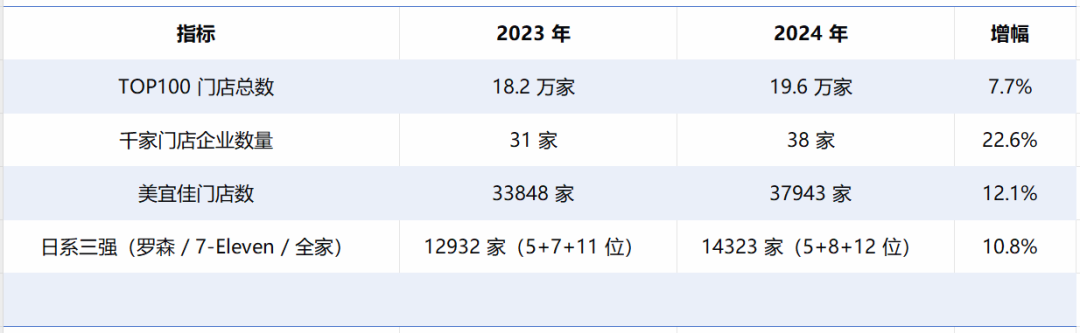 根據(jù)該榜單數(shù)據(jù)顯示,截止2024年12月31日,中國(guó)便利店TOP100企業(yè)門店總數(shù)達(dá)19.6萬(wàn)家,較2023年凈增1.4萬(wàn)家,增幅7.7%。