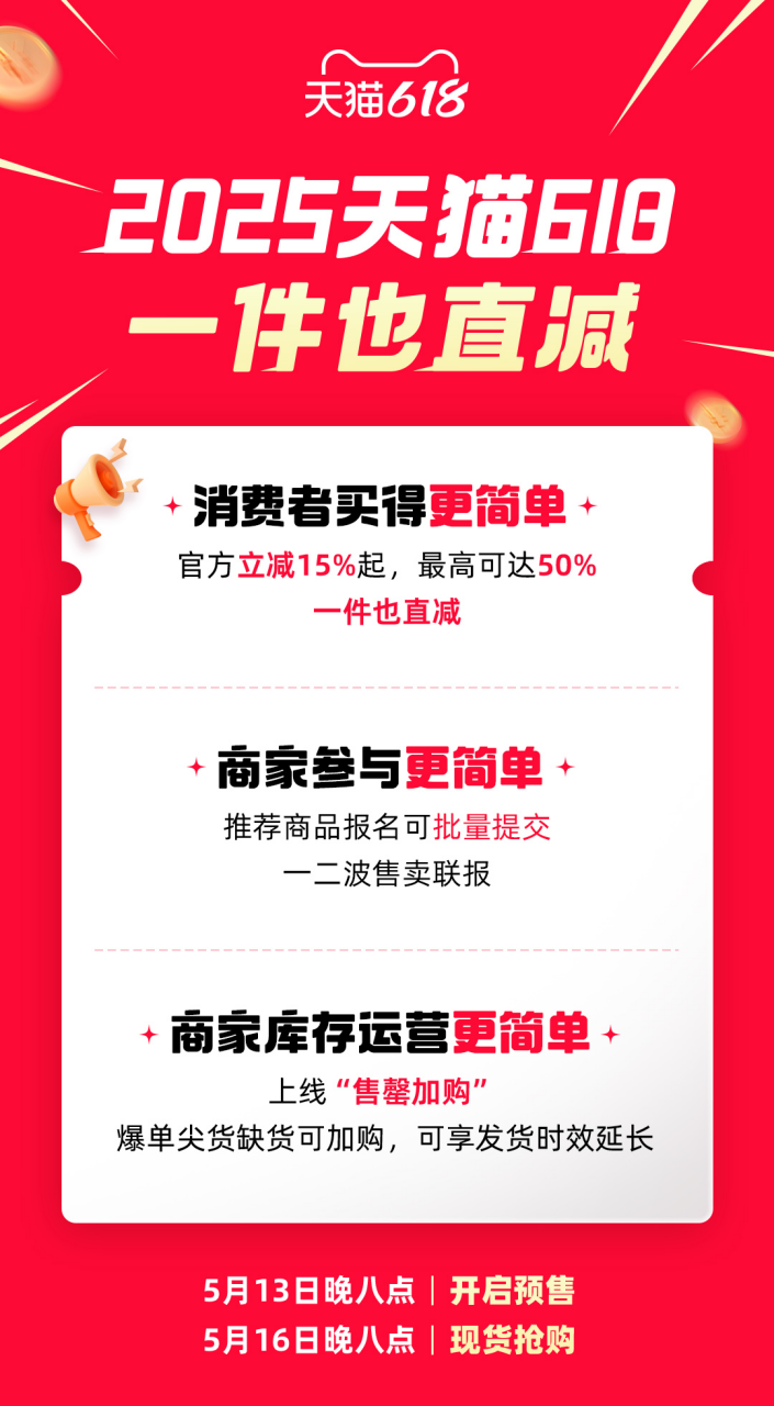 天貓618將于5月13日晚8點(diǎn)開啟預(yù)售,官方立減最高減50%