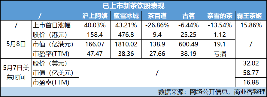 與之對(duì)比,茶百道于2024年4月23日港股上市,首日破發(fā)跌去26.86%;古茗于2025年2月12日敲鐘,首日破發(fā)下跌6.44%;