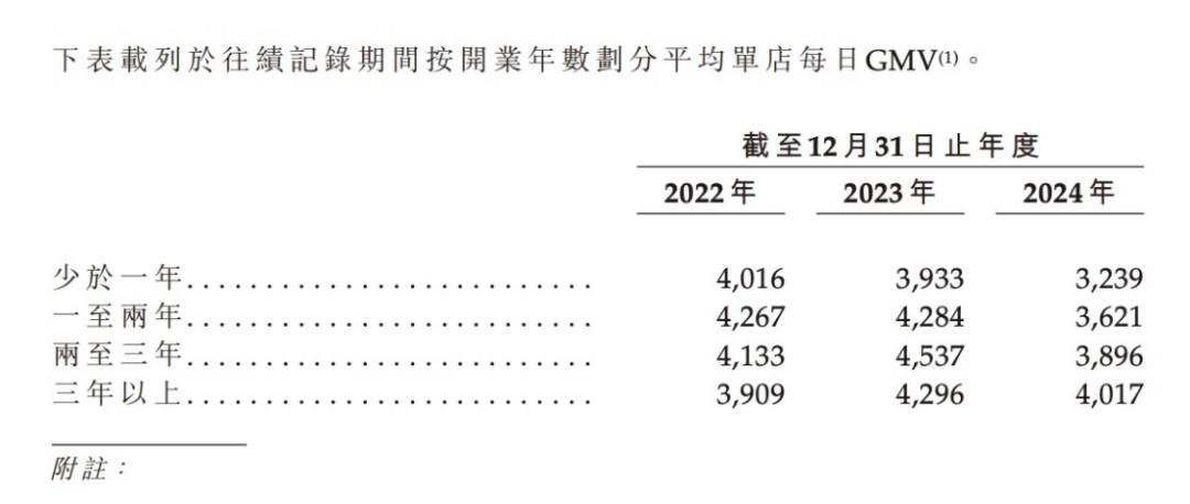 第一組是,少于一年、一至兩年、兩至三年的店,2024年單店日銷售分別同比下滑了17.65%、15.48%和14.13%,只有三年以上的“老店”下滑相對(duì)較少,為6.49%。