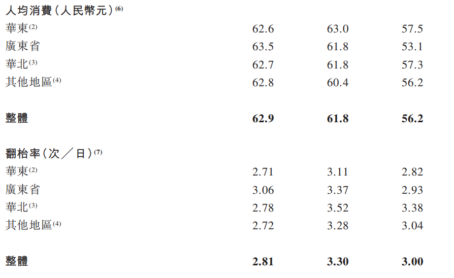 客單價(jià)由2022年的62.9元下滑到2024年的56.2元,整體翻枱率亦由2023年的3.30次下降至2024年的3.00次。