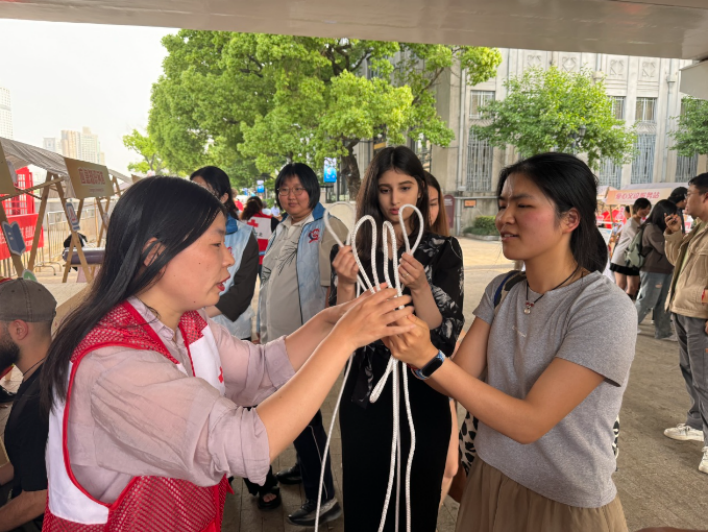 “先拿著兩根繩子左右交叉,右手捏著繩子轉(zhuǎn)過來,這樣打成兩個結(jié),在救援的時候,越扯越緊,非常實用。”在應(yīng)急救援攤位上,來自江北全域(紅十字)應(yīng)急救援中心的志愿者們詳細介紹各種緊急情況下的繩結(jié)法,大家紛紛圍了上來,拿著繩子進行嘗試。