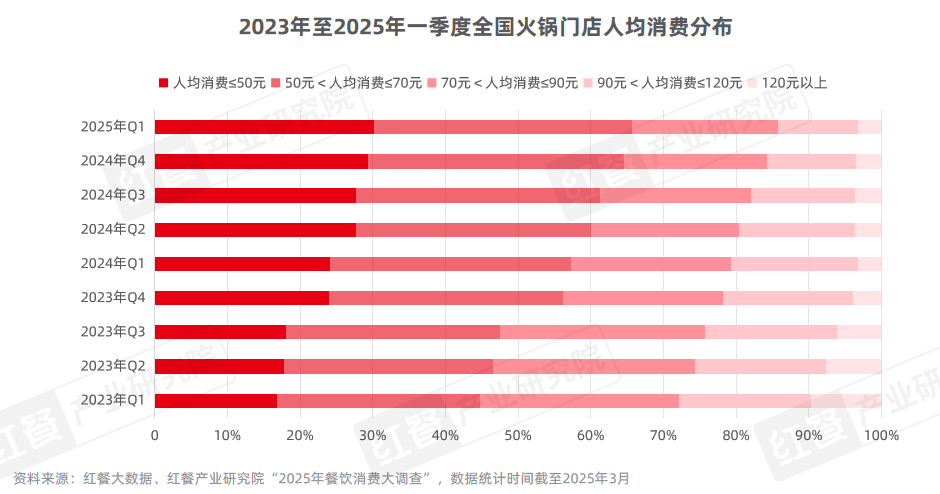 與此同時(shí),在經(jīng)濟(jì)市場(chǎng)環(huán)境變化和消費(fèi)觀念日趨謹(jǐn)慎的驅(qū)動(dòng)下,火鍋的人均消費(fèi)呈持續(xù)下滑態(tài)勢(shì)。紅餐大數(shù)據(jù)顯示,2023年至2025年一季度,人均消費(fèi)在90元以上的火鍋門店數(shù)占比從27.9%降至11%,下降了16.9個(gè)百分點(diǎn);而人均消費(fèi)在70元及以下的火鍋門店數(shù)則由44.8%上升至65.7%,提升了20.9個(gè)百分點(diǎn)。