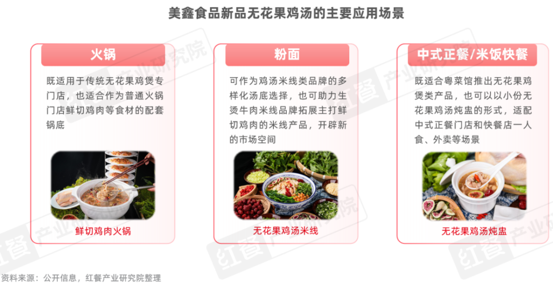 為了滿足其他賽道品牌對(duì)無(wú)花果雞湯產(chǎn)品的創(chuàng)新與研發(fā),部分上游企業(yè)也對(duì)無(wú)花果雞湯的應(yīng)用場(chǎng)景進(jìn)一步拓展。以美鑫食品為例,其在推出了無(wú)花果雞湯底料之后,就分別針對(duì)火鍋、小吃快餐、中式正餐等賽道進(jìn)行應(yīng)用場(chǎng)景研發(fā),并對(duì)不同的應(yīng)用場(chǎng)景需求提供一站式解決方案。