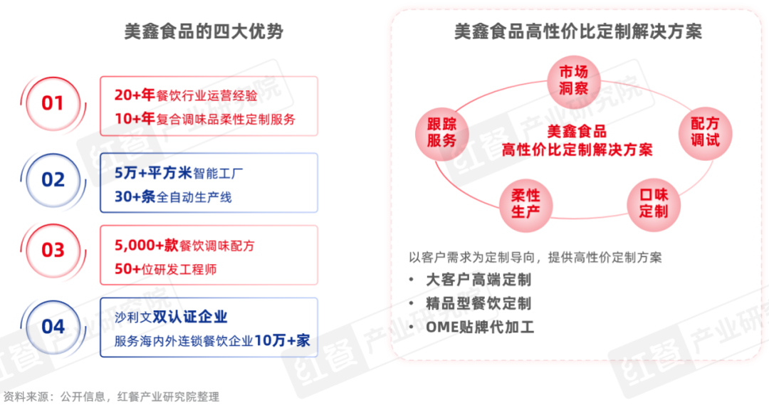 以美鑫食品為例,其是長(zhǎng)三角地區(qū)專業(yè)從事湯汁醬料復(fù)合調(diào)味料研發(fā)、集生產(chǎn)與銷售為一體的現(xiàn)代化企業(yè)。憑借二十余年的餐飲運(yùn)營(yíng)經(jīng)驗(yàn),美鑫食品積累了5,000余款餐飲調(diào)味配方,可為餐飲品牌提供包括配方定制、口味定制、包裝定制在內(nèi)的全鏈路柔性定制解決方案。目前,包括火鍋、中式正餐、小吃快餐等賽道在內(nèi)的多家知名連鎖品牌均與其建立了合作關(guān)系。