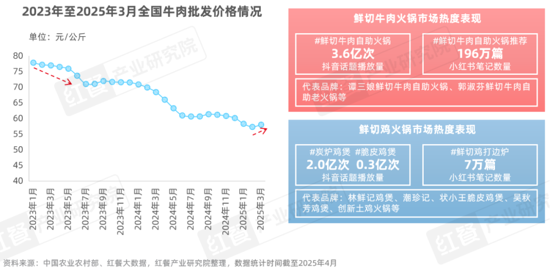 在鮮切食材方面,在牛肉價(jià)格持續(xù)走低的推動(dòng)下,鮮切牛肉火鍋迅速崛起。然而,進(jìn)入2025年3月份以后,隨著國(guó)際關(guān)稅政策的調(diào)整,牛肉進(jìn)口量與牛肉價(jià)格波動(dòng)幅度較大。農(nóng)業(yè)農(nóng)村部數(shù)據(jù)顯示,2025年4月中旬,牛肉批發(fā)價(jià)已上漲至61.53元/公斤,較2025年2月底上漲了7.3個(gè)百分點(diǎn)。因此,不少火鍋品牌開始尋找價(jià)格更加穩(wěn)定的鮮切食材,如鮮切雞。紅餐產(chǎn)業(yè)研究院觀察,市場(chǎng)上已有一批主打鮮切雞肉的火鍋品牌冒頭,而海底撈也于2025年3月在深圳開出了首家“鮮切雞肉工坊店”,主打鮮切清遠(yuǎn)雞。