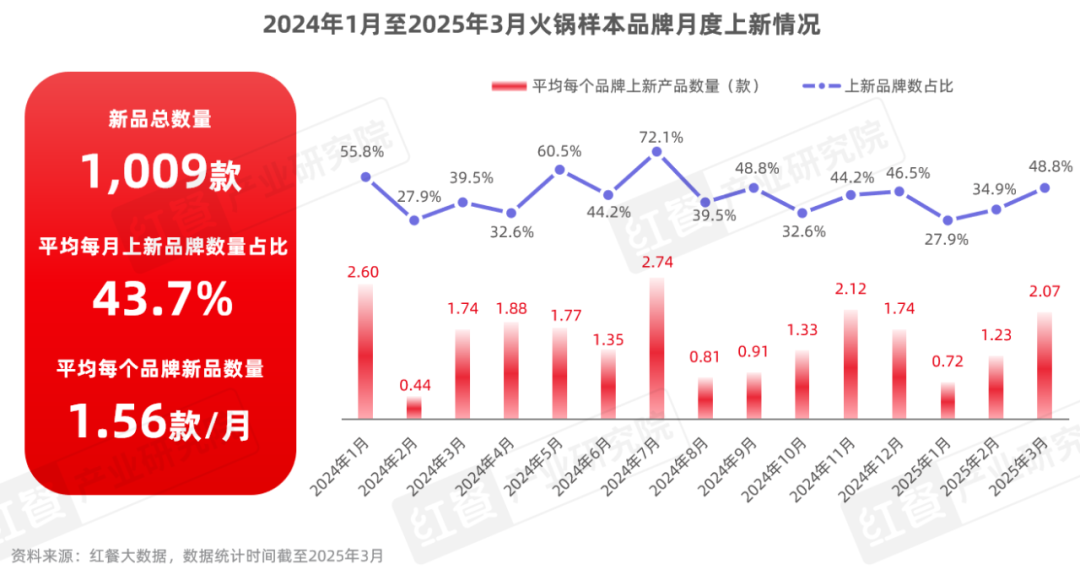 據(jù)紅餐產(chǎn)業(yè)研究院監(jiān)測(cè)的樣本品牌新品數(shù)據(jù),2024年1月至2025年3月,43個(gè)火鍋樣本品牌累計(jì)推出了1,009款新品,平均每個(gè)品牌每月上新1.56款。從月度數(shù)據(jù)來(lái)看,火鍋品牌在春季、盛夏、入冬等季節(jié)推出的新品數(shù)量較多。