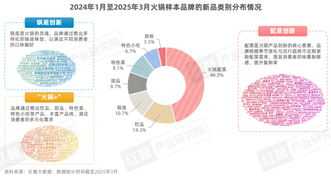 從新品所屬類別來(lái)看,2024年1月至2025年3月,火鍋樣本品牌推出的新品中,火鍋配菜的占比最高,達(dá)46.0%;其次是飲品,占比為14.3%;鍋底居第三位,占比為10.7%。此外,甜品、特色菜以及特色小吃在新品中均有一定的占比。