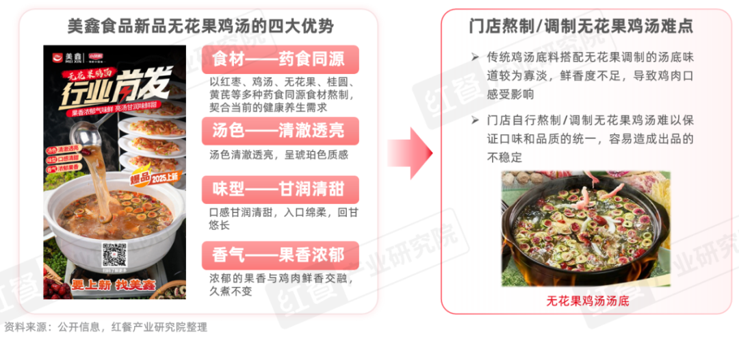 例如,美鑫食品于2025年3月率先推出了無(wú)花果雞湯底料,其以紅棗、雞湯、無(wú)花果、玉米、桂圓、黃芪等為主要食材熬制與調(diào)配,具有湯色清亮、甘潤(rùn)鮮甜、果香濃郁、口感獨(dú)特的特點(diǎn),門店只需在調(diào)配好的湯底中添加紅棗和枸杞兩種配料即可出餐。