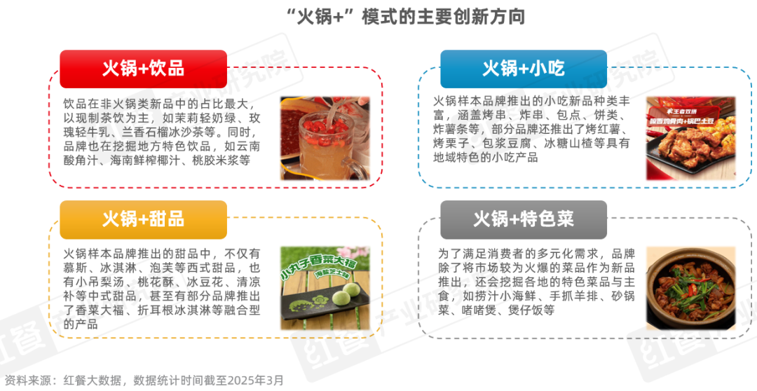 在“火鍋+”方面,隨著餐飲各品類的融合趨勢(shì)日益深化,“火鍋+”模式的應(yīng)用范圍也越來(lái)越廣泛。2024年1月至2025年3月,樣本火鍋品牌推出的新品中,非火鍋類產(chǎn)品的占比超過(guò)了四成,涵蓋飲品、甜品、小吃、特色菜等多個(gè)種類。