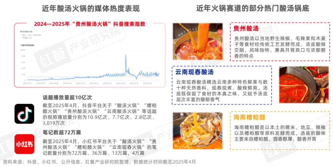 自2024年起,以貴州酸湯、云南酸湯和海南糟粕醋為代表的酸湯火鍋熱度持續(xù)攀升,各細(xì)分賽道均涌現(xiàn)了一批代表品牌。與此同時(shí),眾多火鍋連鎖品牌也推出了酸湯風(fēng)味鍋底。