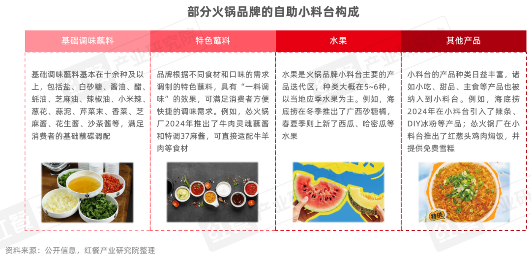 其中,時(shí)令水果、地域特色小吃與特色菜品是小料臺(tái)產(chǎn)品迭代和品牌打造差異化的關(guān)鍵。例如,海底撈會(huì)不定期更換小料臺(tái)的時(shí)令水果,同時(shí)也會(huì)在不同地區(qū)推出特色菜品與小吃,如涼拌魚皮、冰粉、辣條等。