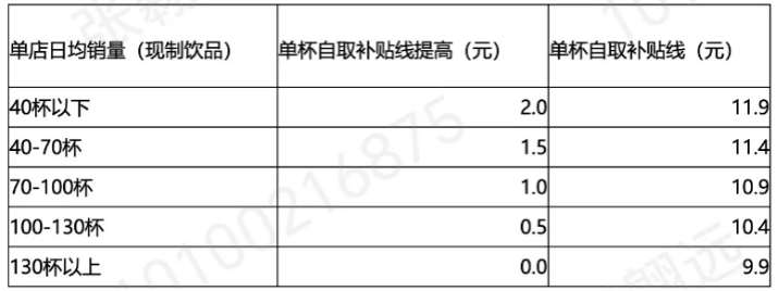 一是下沉市場(chǎng)門店培養(yǎng)補(bǔ)貼,補(bǔ)貼范圍涵蓋地級(jí)以上城市的遠(yuǎn)郊區(qū)縣及其下轄鄉(xiāng)鎮(zhèn)門店。如果門店單店日均銷量低于40杯,每一杯到店(即自提單)多補(bǔ)貼2元,補(bǔ)貼至11.9元;如果在40-70杯,每一杯到店多補(bǔ)貼1.5元,補(bǔ)貼至11.4元;130杯以上則取消補(bǔ)貼,因?yàn)檫@也基本到達(dá)了門店的盈虧平衡點(diǎn)。