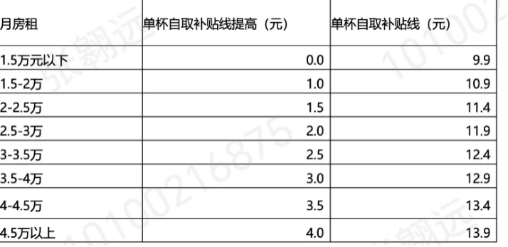 二是針對(duì)高租金的優(yōu)質(zhì)點(diǎn)位給出的高房租補(bǔ)貼。門店月租金在1.5萬-2萬元的,每一杯到店多補(bǔ)貼1元,補(bǔ)貼至10.9元;2萬-2.5萬元租金的,每一杯到店多補(bǔ)貼1.5元,補(bǔ)貼至11.4元;4.5萬租金以上的門店,到店每一杯多補(bǔ)貼4元,補(bǔ)貼至13.9元。