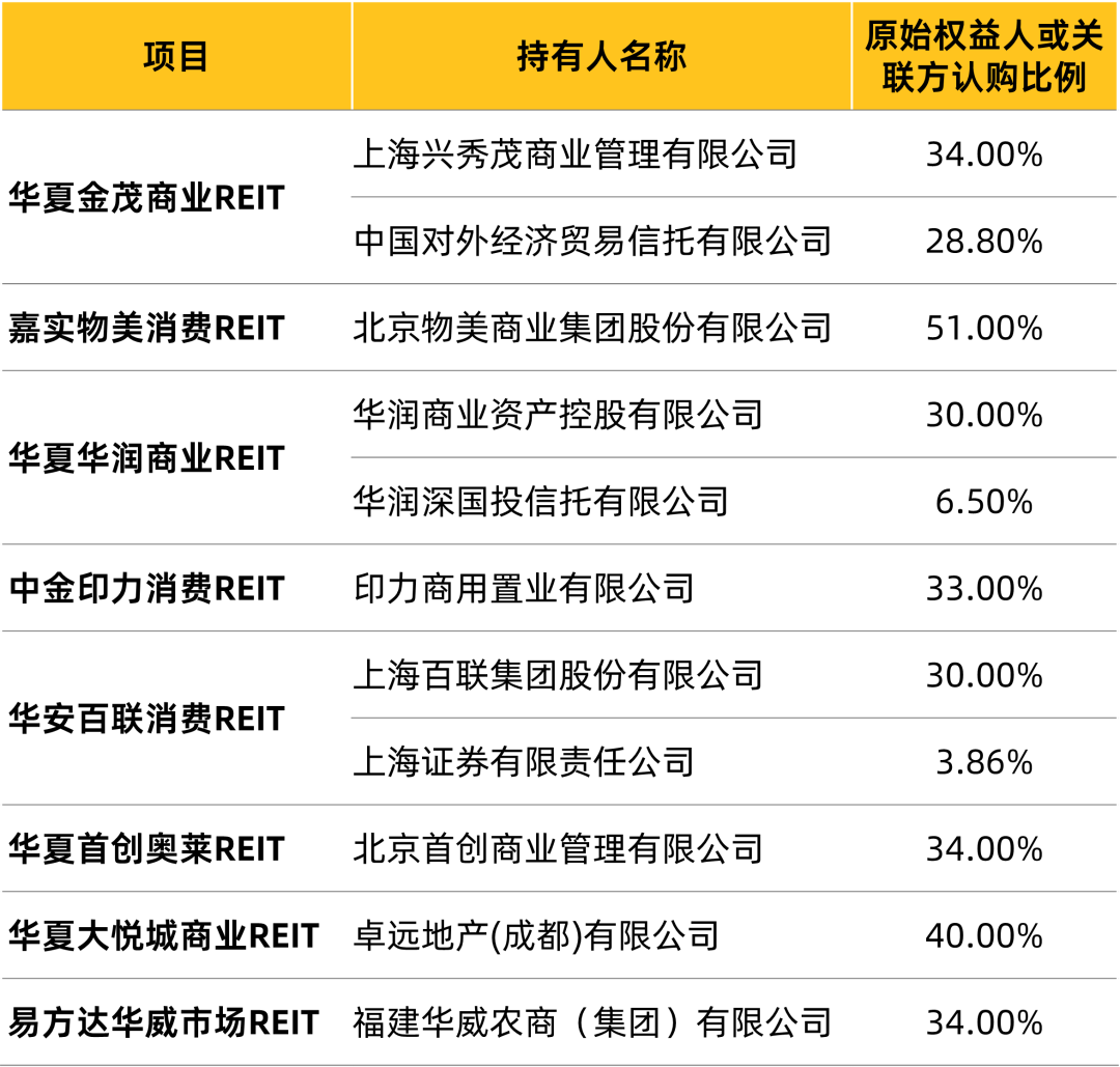 值得一提的是華夏金茂商業(yè)REIT和嘉實物美消費REIT,其原始權(quán)益人或關(guān)聯(lián)方占總數(shù)量比例分別達到62.8%和51%。