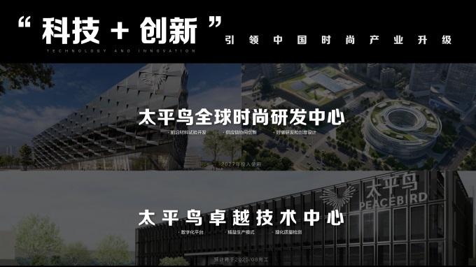在產(chǎn)業(yè)升級方面,依托即將建成的全球時(shí)尚研發(fā)中心和卓越技術(shù)中心,太平鳥也在加快推動(dòng)產(chǎn)業(yè)鏈數(shù)字化進(jìn)程。未來,卓越技術(shù)中心將通過構(gòu)建從開發(fā)到生產(chǎn)交付的全鏈路數(shù)字化系統(tǒng),率先實(shí)現(xiàn)精益生產(chǎn)模式;全球時(shí)尚研發(fā)中心則通過整合材料開發(fā)、創(chuàng)意設(shè)計(jì)、數(shù)字化平臺等創(chuàng)新資源,有望成為輻射區(qū)域經(jīng)濟(jì)的產(chǎn)業(yè)新高地。兩中心協(xié)同發(fā)力,推動(dòng)服裝制造體系由傳統(tǒng)模式向智能化、精細(xì)化全面轉(zhuǎn)型。