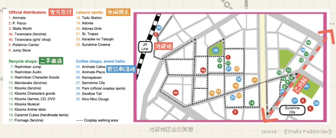 以“乙女路”著稱的池袋,陸續(xù)引入Animate總店獨棟大樓、K-BOOKS、Hareza池袋(匯集了歌舞伎、寶冢歌劇團等8個劇場)、陽光城(內(nèi)含寶可夢中心、天文館、水族館的體驗性綜合體)、Namja Town南夢宮城、J-world tokyo室內(nèi)主題樂園、Comic虎之穴、萬圣節(jié)cosplay大會,取代青山和澀谷,成為大學生和女校學生逛街的首選目的地。