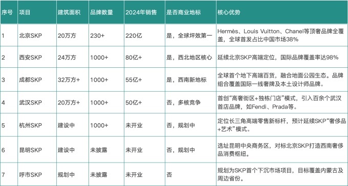 全國化布局:已覆蓋北京、西安、成都、武漢,杭州項目在建,昆明、呼市也在規(guī)劃中,SKP下沉到新一線逐步形成核心城市網絡布局。