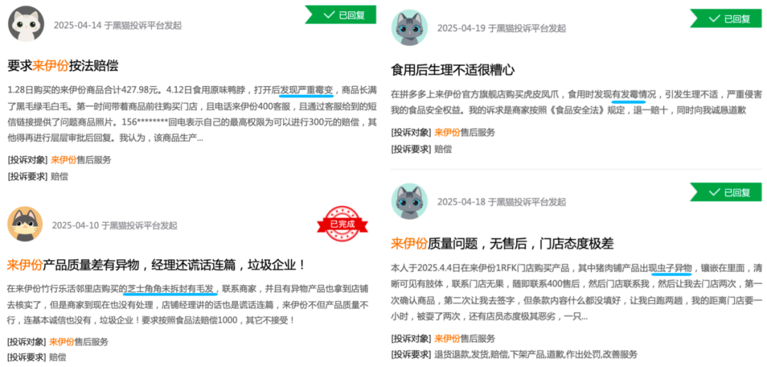 值得注意的是,來伊份近三年投訴量激增。黑貓投訴平臺(tái)上,關(guān)于來伊份的多條投訴內(nèi)容直指食品中吃出蟲子、毛發(fā)等異物,以及存在霉變等問題。