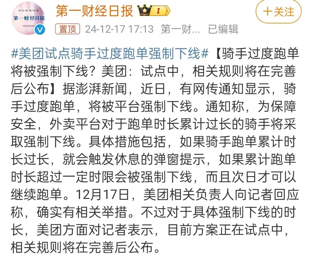 當時,“美團試點騎手過度跑單強制下線”的話題還沖上了熱搜,引發(fā)廣泛討論。