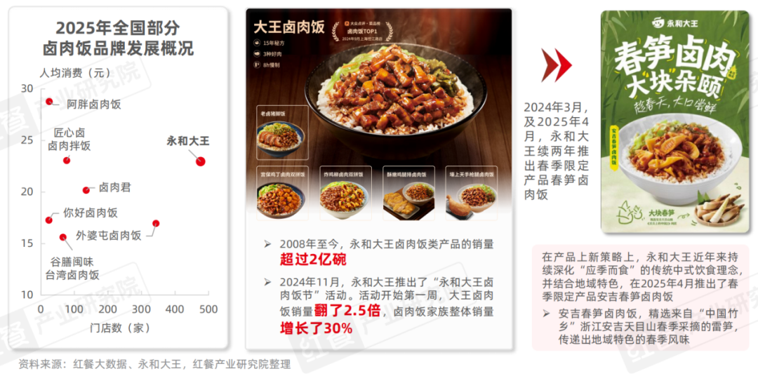 還有,作為鹵肉飯頭部品牌的永和大王,近年通過(guò)推出了健康豆食系列,以植物蛋白新主張回應(yīng)健康飲食浪潮,受到消費(fèi)者歡迎。據(jù)紅餐大數(shù)據(jù),截至2025年4月,其全國(guó)門(mén)店數(shù)超過(guò)490家。另外,南城香、超意興等中式米飯快餐品牌也依然保持著良好的發(fā)展態(tài)勢(shì)。