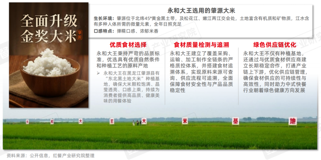 由此可見(jiàn),永和大王正積極打通“從田間到餐桌”的溯源閉環(huán),致力于為消費(fèi)者帶來(lái)更健康與美味的餐飲體驗(yàn)。比如,2024年9月,其對(duì)米飯進(jìn)行全面升級(jí),選用了肇源大米,在黑龍江省肇源縣有“東北黑土地大米”種植基地,為全國(guó)范圍內(nèi)超過(guò)490家餐廳提供優(yōu)質(zhì)東北大米,實(shí)現(xiàn)從田間到餐桌的溯源。
