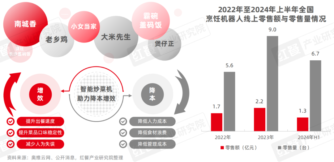同時(shí),消費(fèi)者對(duì)烹飪機(jī)器人的興趣與接受度也日益增強(qiáng)。相關(guān)數(shù)據(jù)顯示,2024年上半年,全國(guó)烹飪機(jī)器人的零售額達(dá)到1.3億元,零售量達(dá)到6.7萬(wàn)臺(tái),分別占2023年全年的59.1%、74.4%。當(dāng)下,智能炒菜機(jī)器人已在連鎖餐飲門(mén)店、外賣(mài)廚房、社區(qū)食堂等多個(gè)場(chǎng)景實(shí)現(xiàn)落地應(yīng)用。拓邦股份廚紀(jì)智能炒菜機(jī)器人、橡鹿科技、飪芯機(jī)器人等智能商用烹飪?cè)O(shè)備研發(fā)生產(chǎn)企業(yè)受到廣泛關(guān)注。
