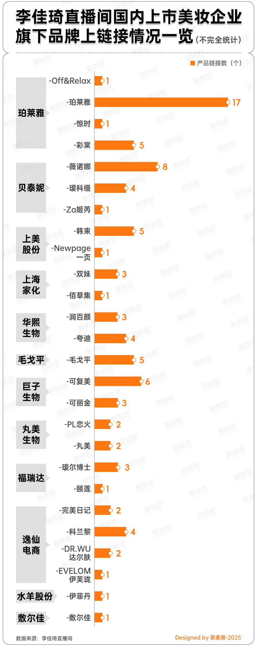 先聚焦國貨在李佳琦直播間的境況來看,據(jù)聚美麗不完全統(tǒng)計,今年618至少有12家國內(nèi)美妝上市企業(yè)押注了李佳琦直播間,珀萊雅、巨子生物、貝泰妮、上美股份、毛戈平、逸仙電商、福瑞達、華熙生物、上海家化、丸美生物、水羊股份、敷爾佳均與李佳琦展開了產(chǎn)品鏈接合作,鏈接總數(shù)為87個(未計入自然堂、歐詩漫等未上市企業(yè)SKU數(shù)量)。
