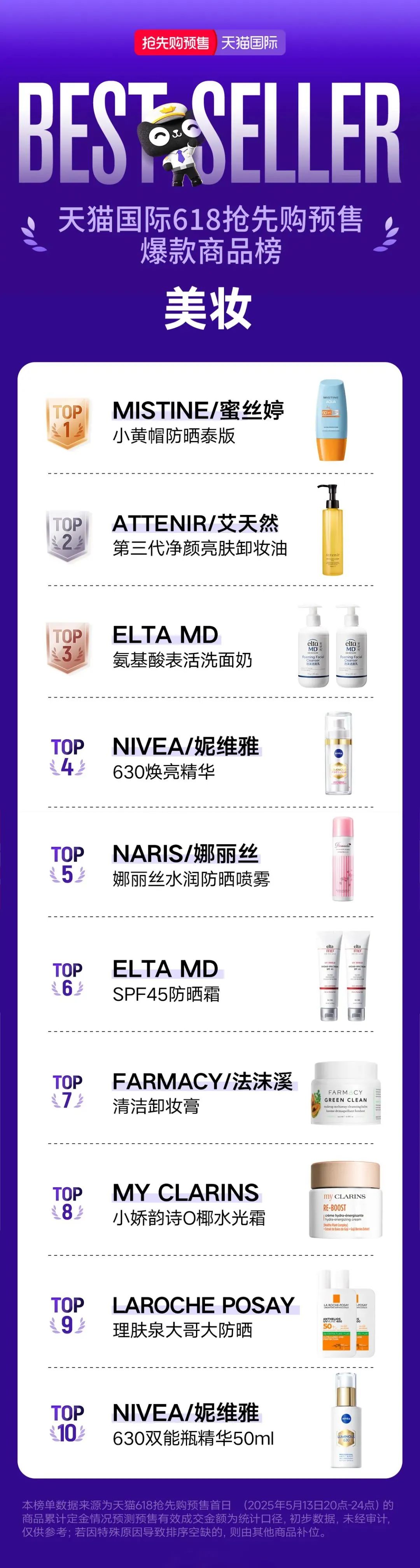 并且,在天貓國際于5月14日發(fā)布的天貓國際預售美妝榜單中,蜜絲婷防曬登頂榜首。其后分別是艾天然卸妝油、ELTA MD洗面奶、妮維雅630煥亮精華等。