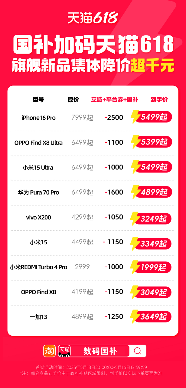 5月16日晚8點(diǎn),2025年天貓618將正式開售。國補(bǔ)加碼的618,手機(jī)旗艦新品全線大降價(jià)。蘋果直降2000元,iPhone16 Pro首次納入國補(bǔ),優(yōu)惠2500元;華為、小米、OPPO等品牌紛紛加入戰(zhàn)局,6000元以上旗艦機(jī)型均降價(jià)至國補(bǔ)范圍內(nèi),疊加618平臺券,旗艦機(jī)型均便宜1000元以上。