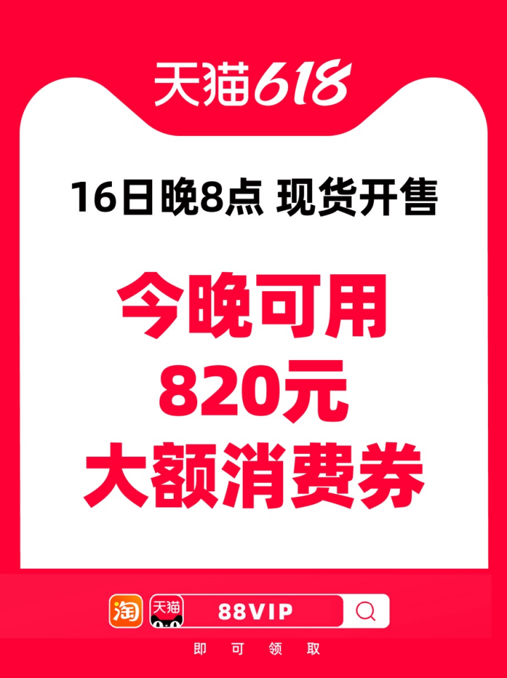 5月16日晚8點(diǎn),天貓618正式開(kāi)賣(mài),“立減85折”基礎(chǔ)上,可再用88VIP 820元大額消費(fèi)券。