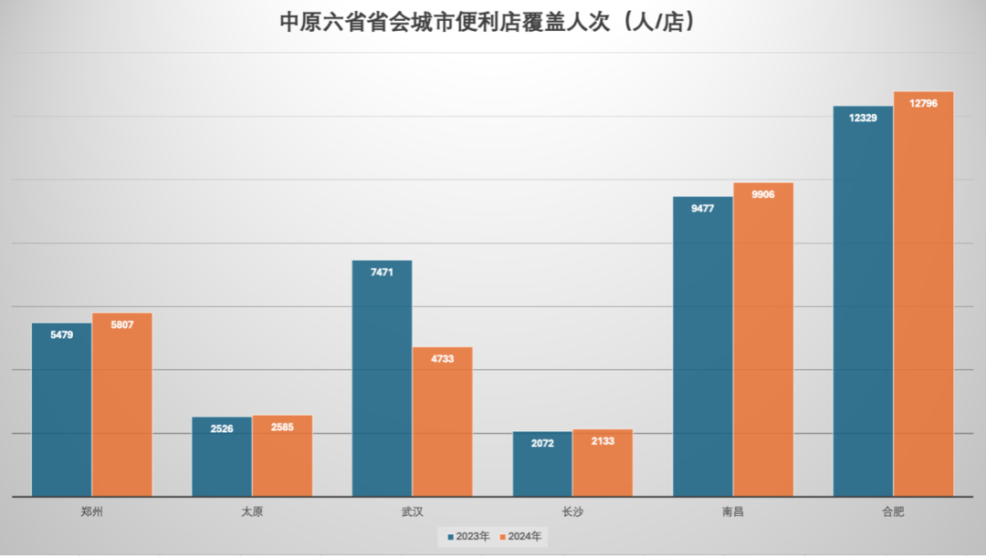 根據(jù)2024年的數(shù)據(jù),在中部六省的省會(huì)城市中,鄭州便利店人均覆蓋數(shù)排名第四,僅高于江西南昌(9906人/店)和安徽合肥(12796人/店)。