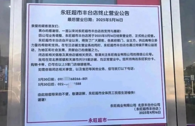 5月9日,永旺商業(yè)有限公司發(fā)布《永旺超市豐臺店終止營業(yè)公告》,明確表示因業(yè)務(wù)調(diào)整,北京豐臺店將于5月16日正式關(guān)閉。